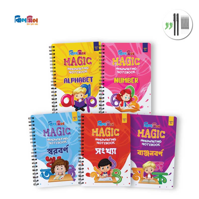 সোনামণিদের হাতের লেখা সুন্দর করার জন্য সেরা উপহার!পণ্যের নাম: ঝিলমিল ৫ পিসের প্রিমিয়াম ম্যাজিক হ্যান্ডরাইটিং সেট।সাইজ: ১০ ইঞ্চি $\times$ ৬.৫ ইঞ্চি (বড় সাইজ)।কাগজের মান: ৩০০ GSM (অত্যন্ত পুরু ও উন্নত মানের কার্ডবোর্ড পেপার)।পৃষ্ঠা: ৫টি খাতা মিলিয়ে মোট ১২০টি পৃষ্ঠা।ফ্রি উপহার: ২ টি ম্যাজিক কলম, ১০ টি শিষ, ২ টি গ্রিপার এবং নিশ্চিত পুরস্কারের জন্য ১টি লাকি কুপন।ডেলিভারি: সারা বাংলাদেশে একদম ফ্রি ডেলিভারি!